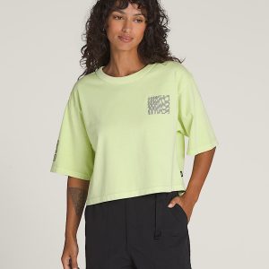 Crewneck shirt for a classic look short sleeves for a casual, everydayOrganic cotton jersey fabricationRibbed neckbandGarment dye wash for a vintage lookScreen printed graphics on the chest and backBoxy, cropped fit100% cotton