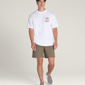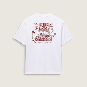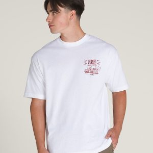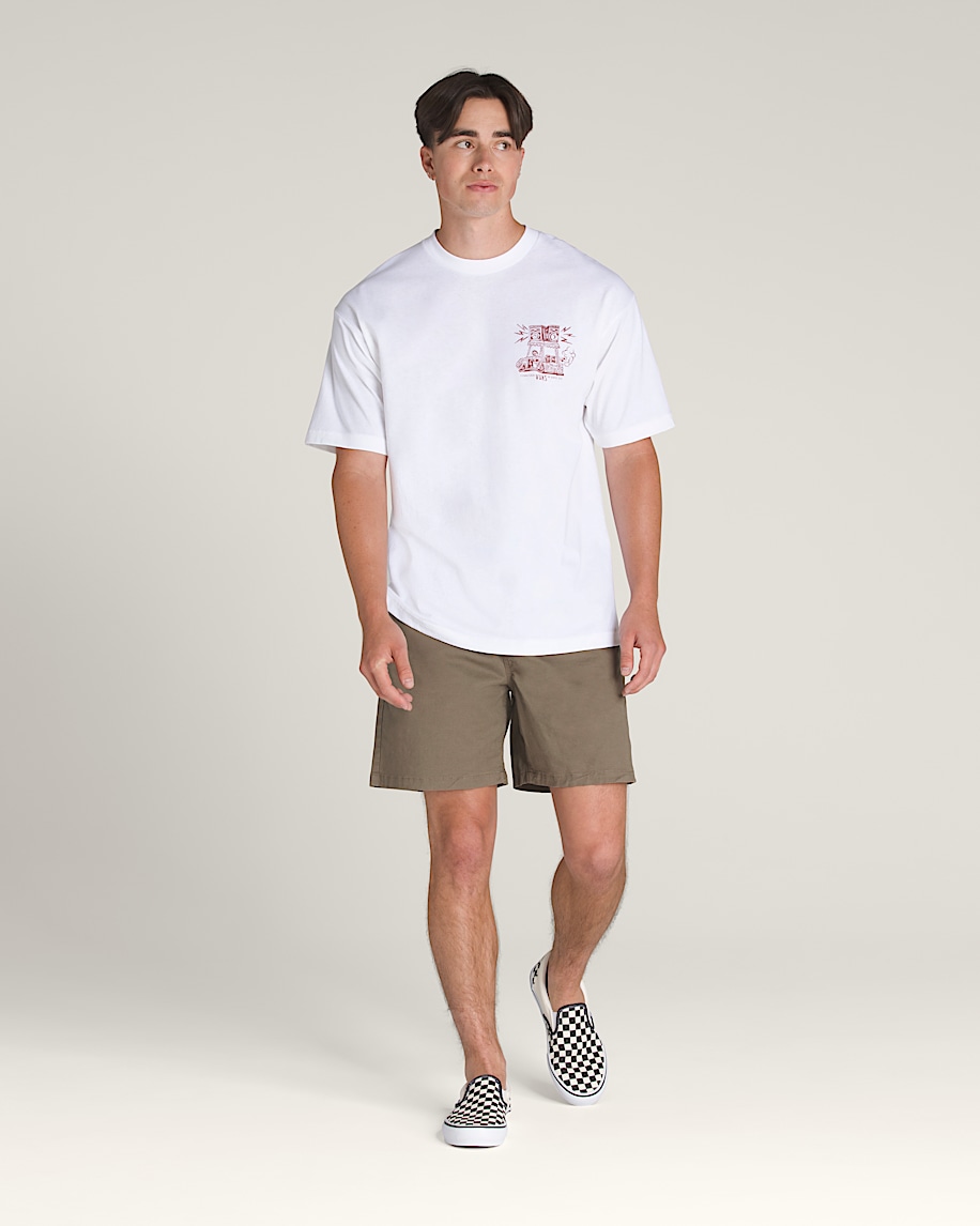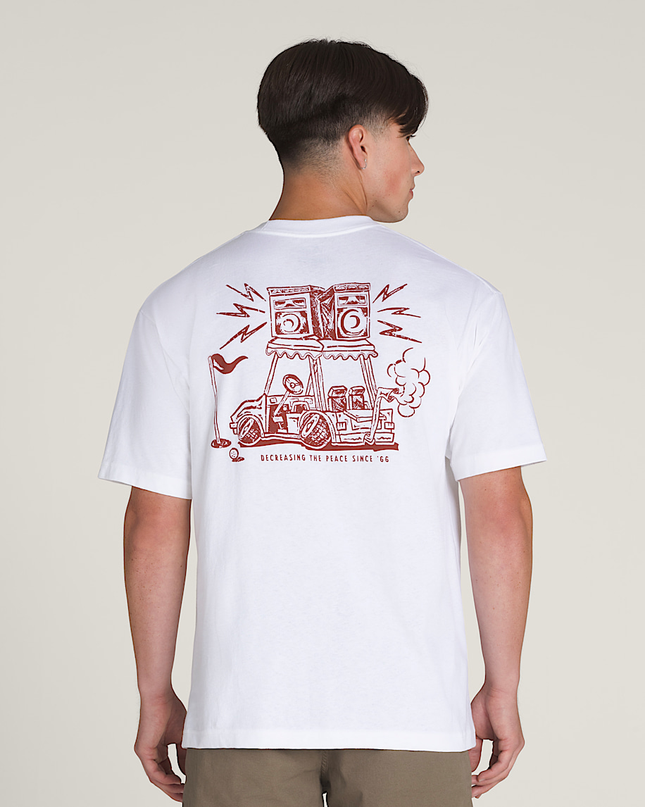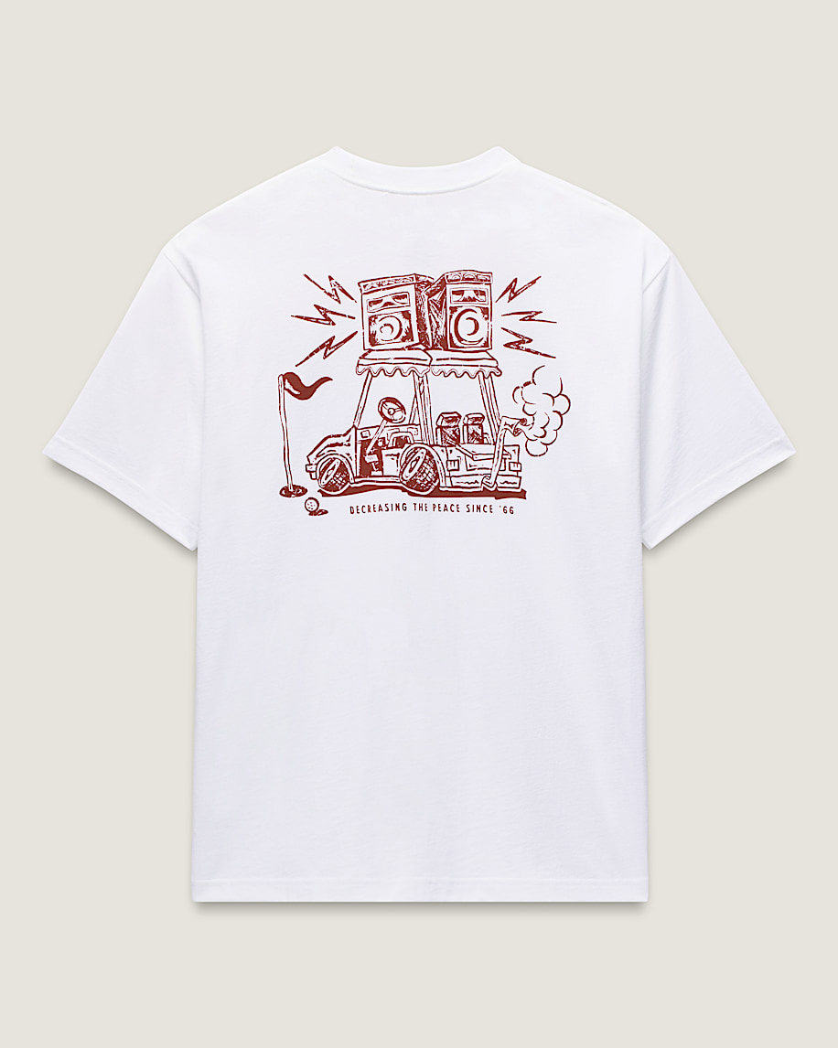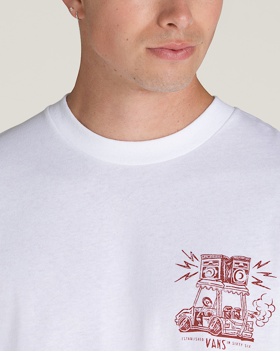 Turn up the volume in the Boom Cart T-Shirt, a loose fit short sleeve crew neck T-shirt with screenprinted graphics of a tricked-out golf cat with stereo speakers atop a Vans® logo on the front, and a larger version of the same graphic on the back.