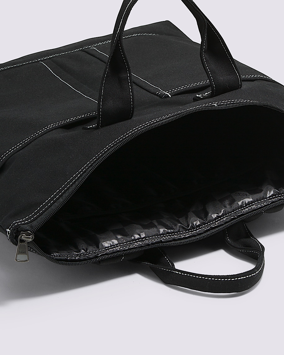Shell: 100% Cotton fabricLining: 100% Polyester fabricMain compartment with zip closureInterior media sleeveExterior slip-in pocketsHandles at openingCapacity: 14 LitersDimensions: 17'' x 14 1/2'' x 3''