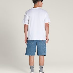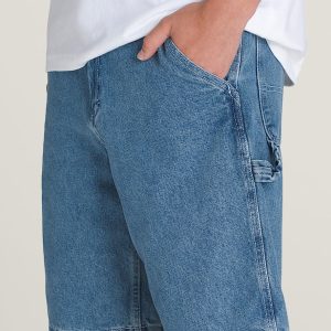 Heavyweight woven denim shortTraditional carpenter style detailsFront slash hand pockets with coin pocketRear patch pocketsHammer loop and tool pocket'V' belt loop detail on back waistbandLoose fit for a roomy look and a free-flowing shapeOutseam: 22"100% cotton