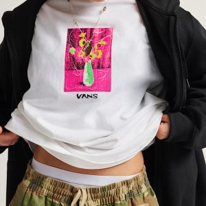 Let yourself bloom in the Floral Decor T-Shirt, a loose fit short sleeve crew neck T-shirt with a screenprinted graphic of a vase full of flowers in neon colors atop the Vans® logo on the front.