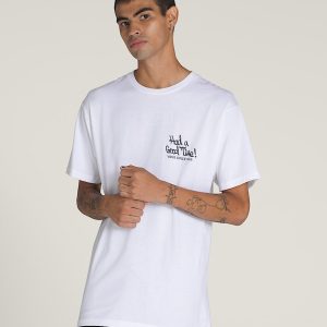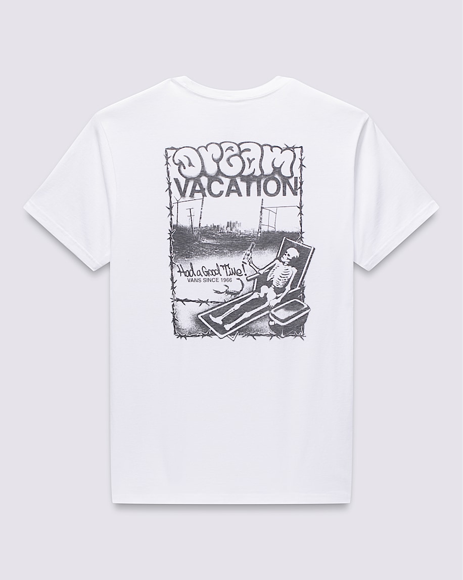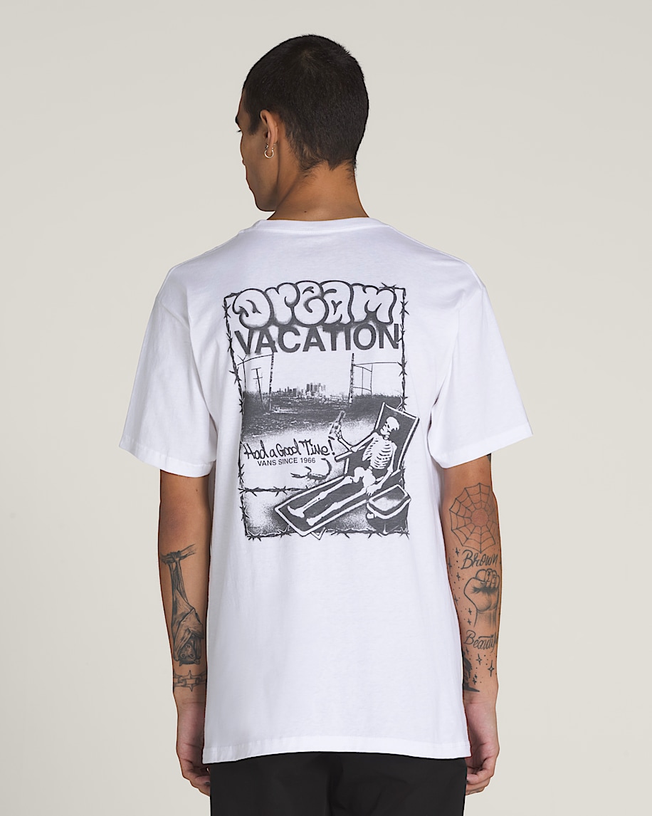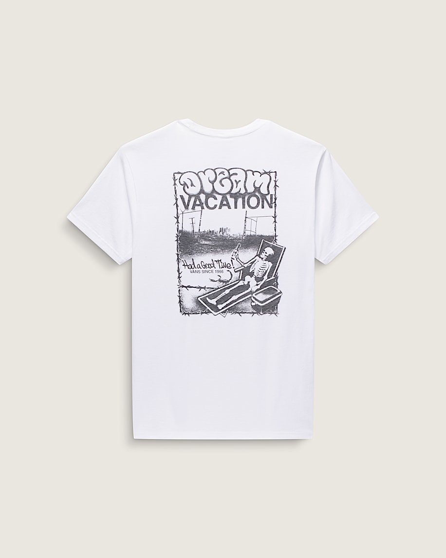 Set your OOO in the Good Times 66 T-Shirt, a classic fit short sleeve crew neck T-shirt with a screenprinted graphic on the front that says, ''Had a Good Time!'' with a graphic on the back of a skeleton on its dream vacation.