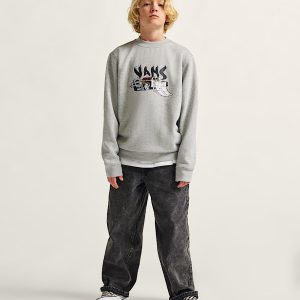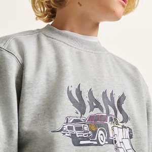 The Kids Copout Loose Crew Sweatshirt is a classic long sleeve crew neck sweatshirt with ribbed details, featuring a screenprinted graphic of a toasted cop car ripe for jumping on your board with a Vans® logo floating over top.