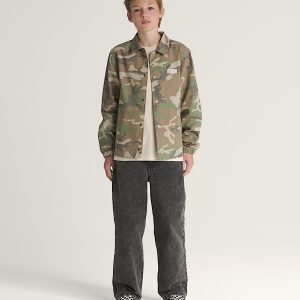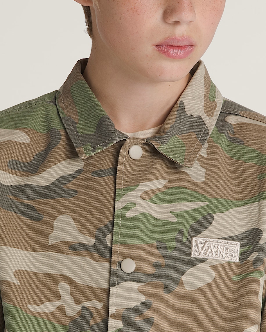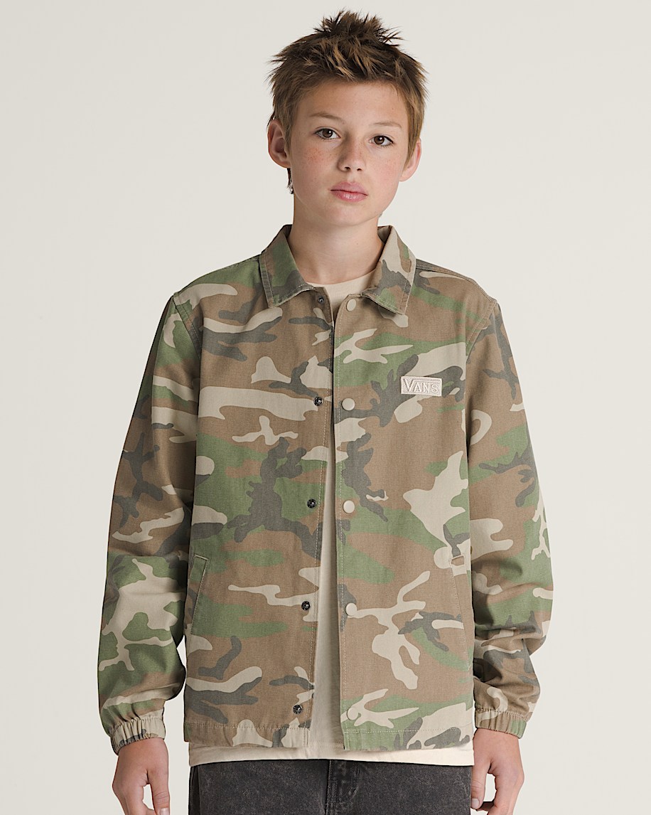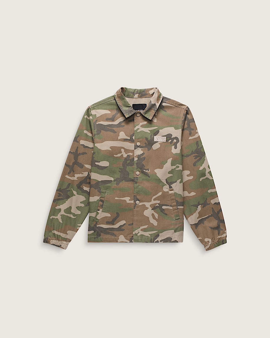 Reminiscent of retro sports jackets, the Kids Torrey Windbreaker Jacket is made of a durable woven cotton canvas. Along with a classic embroidered Vans® logo on the chest, this easy-wearing coaches jacket has a snap button closure, welt hand pockets, and a drawstring at the hem for a customizable fit.