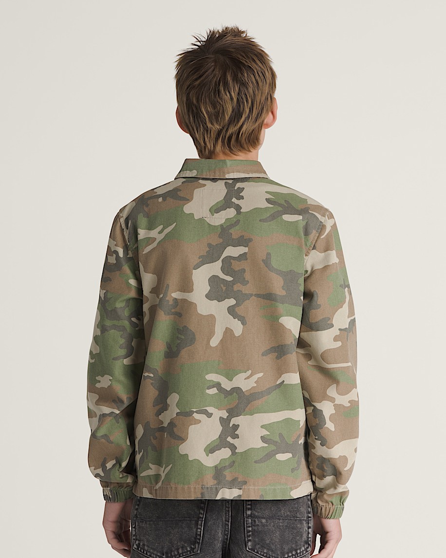 Woven cotton canvas fabrication for extra durabilitySnap button front closureDirect embroidery logo at left chestWelt hand pocketsDrawstring at hemAllover camo print100% cotton