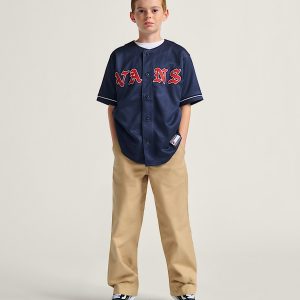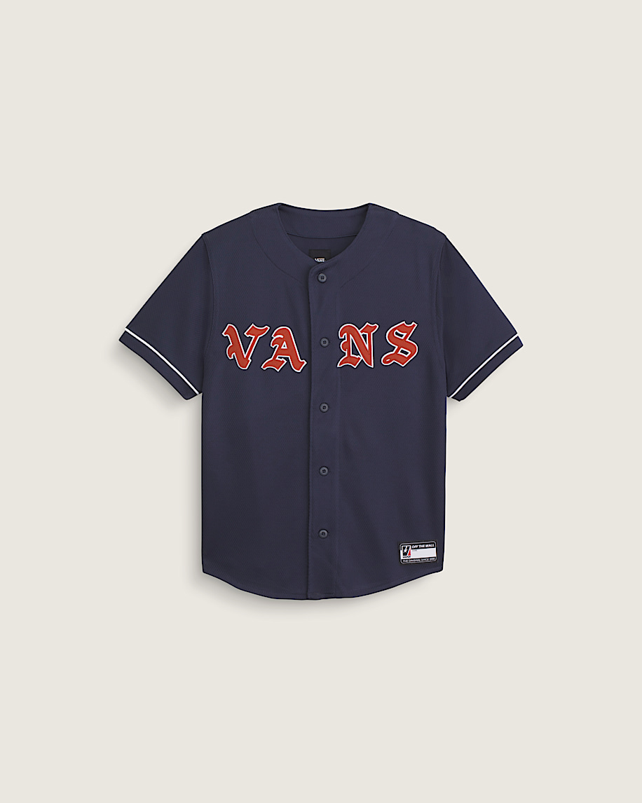 Take a swing in the Kids Ye Olde Vans Baseball Jersey, a heavy cotton mesh short sleeve shirt with an old English-style Vans® logo applique on the front.