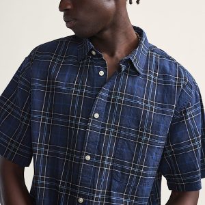 Short sleeves and button closure for easy wearYarn-dyed plaid for lasting colorOpen patch pocket at chestBranded flag label at side seamRounded hemline for a relaxed finish75% cotton, 25% linen