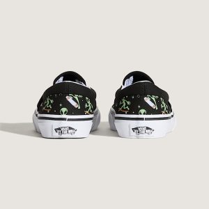 Iconic slip on shoe made for kidsGlow-in-the-dark alien print adds extra funLow profile canvas uppersSupportive padded collarsElastic side accentsSignature rubber waffle outsoles