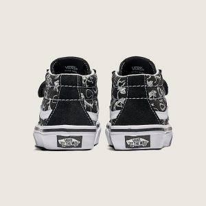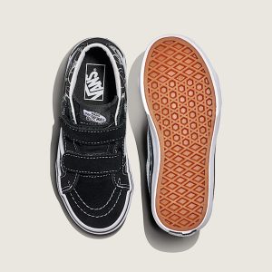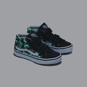 Little kids mid top shoeRecommended for ages 4 – 8 yearsSturdy suede and canvas uppersPadded collar for enhanced support and comfortDouble hook-and-loop closures for easy on and offDurable rubber sidewall with classic foxing stripeReinforced toe bumper for heavy wear and tearSignature waffle outsole pattern for reliable grip since '66Vulcanized sole for superior board feel and flexibilityIconic Sidestripe™ insigniaGlow-in-the-dark skeleton artwork