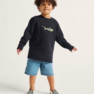 Classic crewneck fit built for easy layeringBrushback fleece fabrication for extra cozinessRibbed cuffs and hem lock in warmthGlow-in-the-dark shark graphic70% cotton, 30% polyester