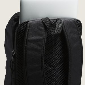 Main zippered compartment holds everyday gearSmall top front zip pocket for quick-grab itemsLined media pocket protects electronicsInternal sleeve fits laptops up to 15"Internal organization system keeps things sortedWater bottle pockets fit most bottlesSkateboard straps secure your board when not ridingErgonomic, padded shoulder straps for comfortAdjustable sternum strap adds stabilityWaffle mesh back panel improves airflowDimensions: 18" x 11" x 6"Capacity: 23 litersShell: 100% nylon with polyurethane coatingLining: 100% polyester with polyurethane coating