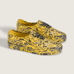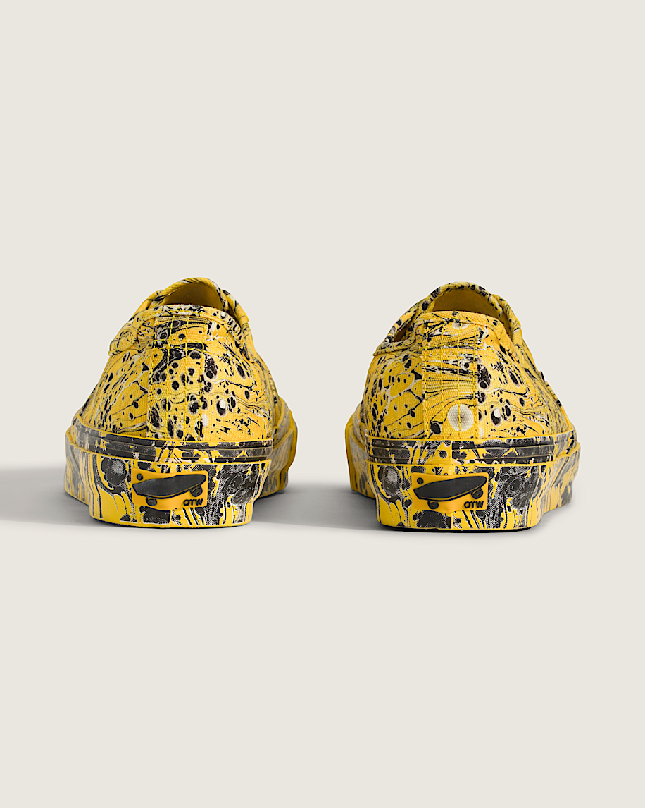 Sterling Ruby's cyber yellow take on the original Vans silhouette. Inspired by the designs of marbled paper, the design provides an optical illusion that extends from the upper to the foxing for a cohesive, trippy visual design. A leather lining and padded collar combine with a cushioned insole to enhance the comfort of this original Vans silhouette. This shoe also marks the first release of the newly designed tank tread Vibram outsole. A black cotton S.R. Studio LA. CA. lace, a second cyber yellow lace, branded footbed, and custom S.R. Studio LA. CA. tag on the tongue makes this Authentic drip Sterling Ruby from the inside out.