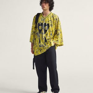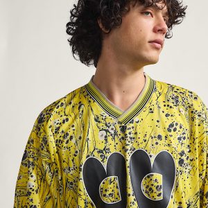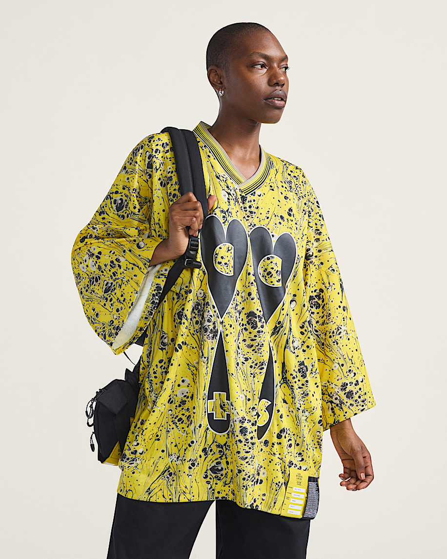 Sterling Ruby infuses this oversized hockey jersey with his bold designs, taking iconography inspired by his previous work to create an eye catching piece with yellow marbling, teardrop hearts and oversized, military-style tags throughout. Closed mesh fabric throughout is joined by a soft, ribbed neckline for added comfort where it matters most.