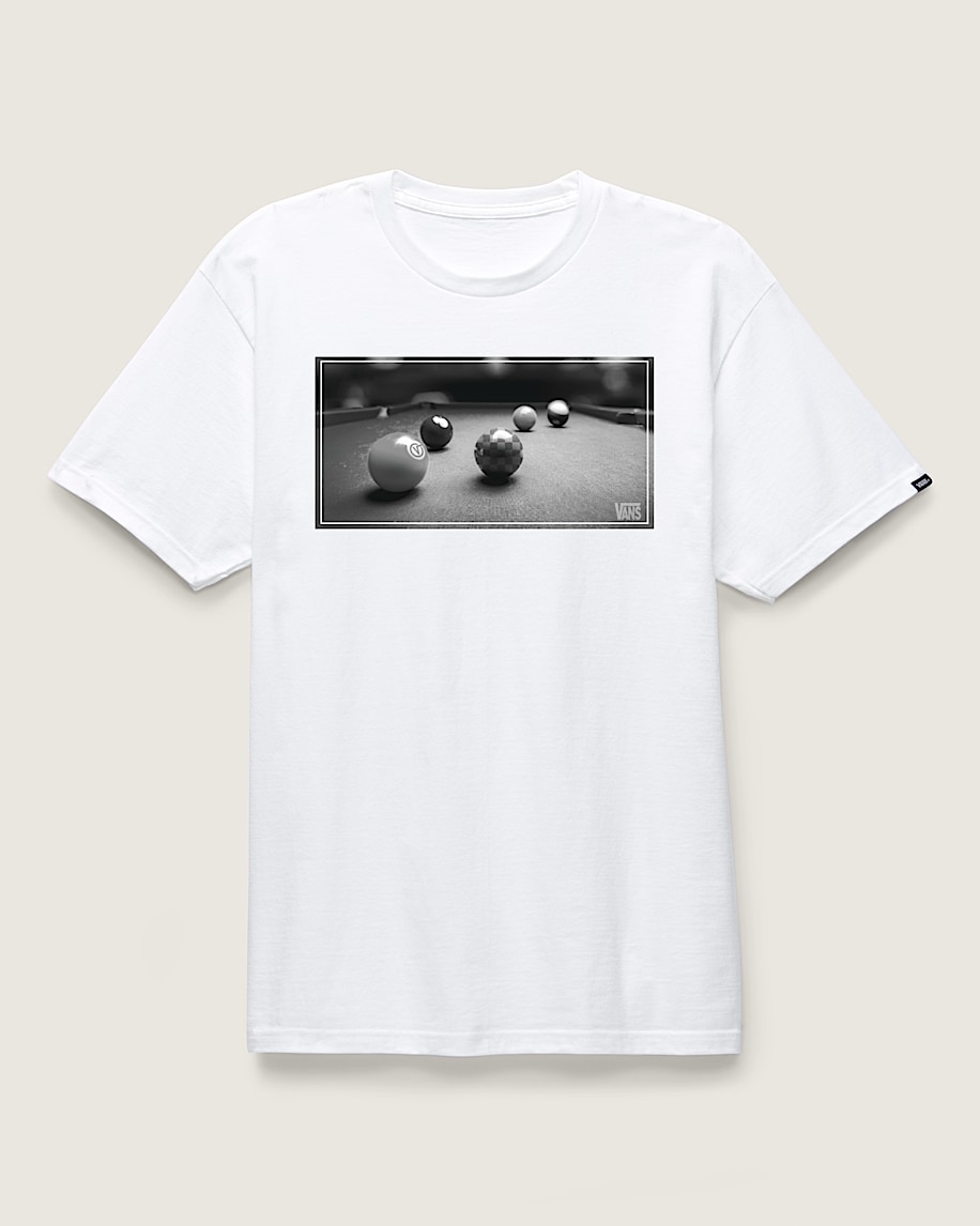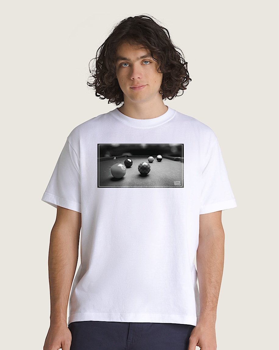 The Pocket T-Shirt is a short sleeve crewneck T-shirt made from a heavier weight cotton with a screenprinted graphic of a billiard set.