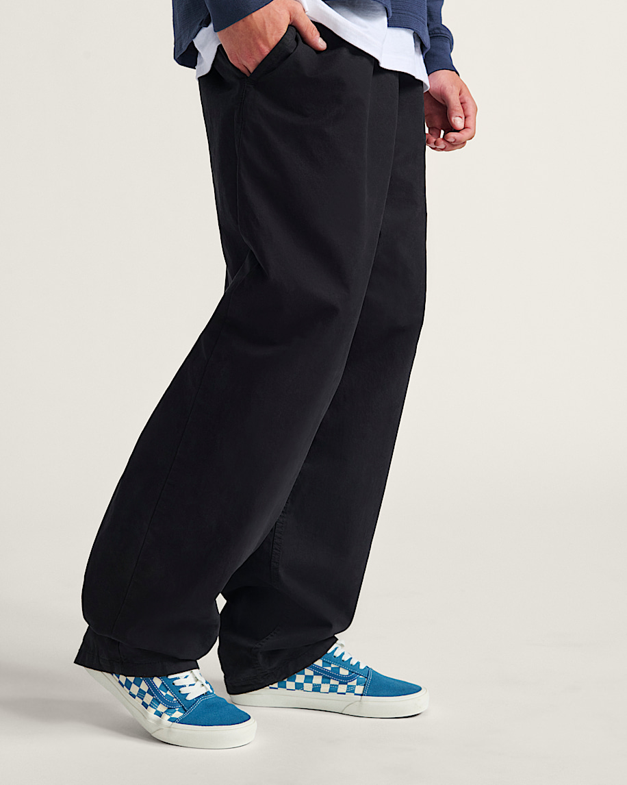 The Range Baggy Pants give you all the style, comfort, mobility, and skateability you need to make a statement on and off your board. This pair of easy pull-on pants has an elastic waist for all-day, everyday wear, and a baggy fit through the hip and thigh, ending in a tapered leg. It also features Drop-V bar tack embroidery at the side seam and pockets, a key loop on the right rear waistband, and a branded flag label sewn into the hem of the leg opening that’s visible when cuffed.