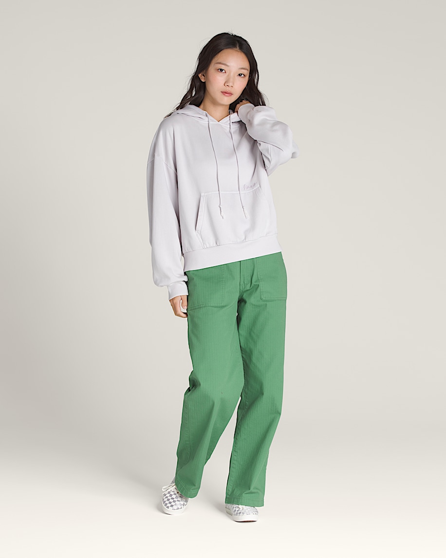 Pullover hoodie with kangaroo pocketEmbroidered logo detailPigment wash for worn-in lookFleece fabricationTunneled drawcordRibbed cuffs and hem70% cotton, 30% polyester