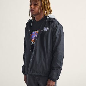Water-resistant nylon coaches jacketFleece-lined hood and bodyScreen-printed artwork at left chestElastic cuffsDrawstring at bottom hem100% nylon shell