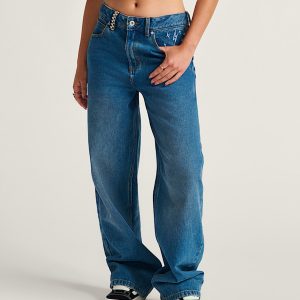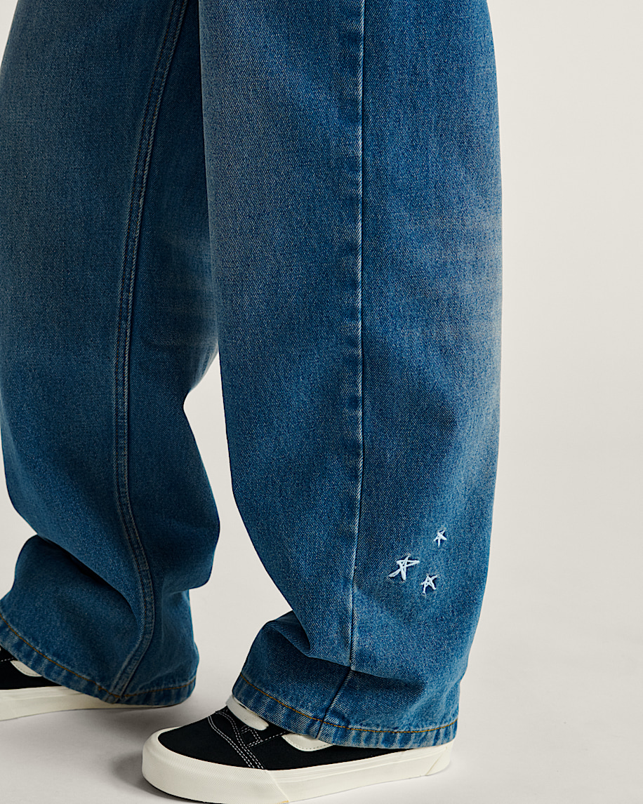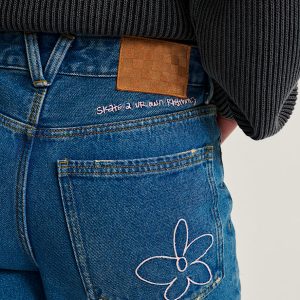 Heavyweight 14oz denim for lasting wearLightly faded wash for a worn-in lookClassic 5-pocket designMid-rise, baggy fit with puddle-length legsFloral and star embroidery for a custom touchCheckerboard suede patch at back waistband“Skate 2 UR own rhythm” embroidered at waist100% cotton
