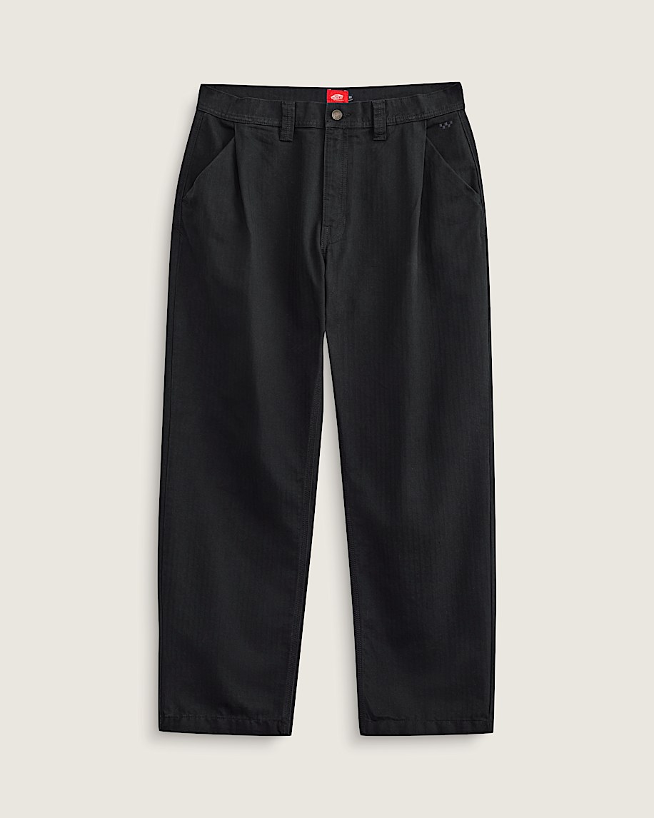 Designed for skate–works off the board, tooPart of the Curren Caples signature collectionAdded pleat allows for more volume for freedom of movement and styleEmbroidered Checkerboard logo above left side pocketButton closure on waistbandBack welt pocketsFront hand pockets10 oz cotton herringbone fabricInseam: 30"