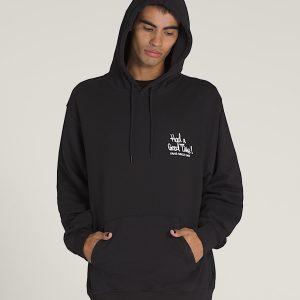 The Skull Reaper Good Times Pullover Hoodie is a loose fit pullover with a midweight French terry fabrication for comfort and durability. It also features a classic kangaroo pocket, ribbed details, and a screenprinted graphic on the front that says, ''Had a Good Time!'' with a graphic on the back of a skeleton on its dream vacation.