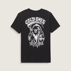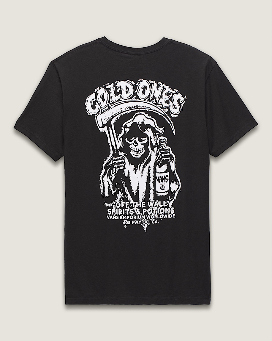 The Skull Reaper Spirit World T-Shirt is a classic fit short sleeve crew neck T-shirt with a screenprinted graphic of the Vans® logo on the left chest, and the grim reaper with a cold one on the back.