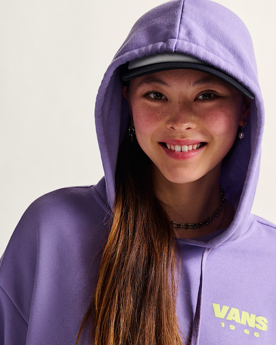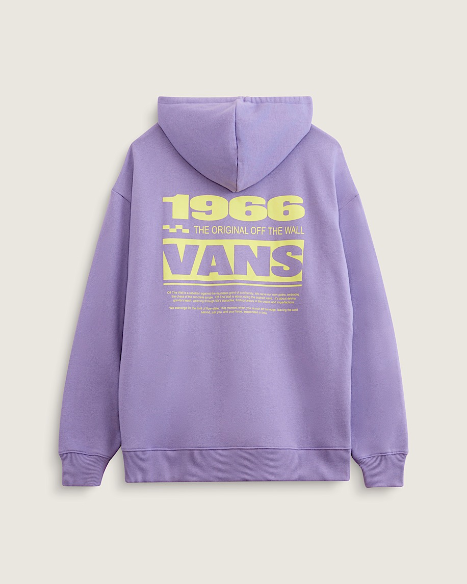 The Suspension Hoodie is a classic kangaroo pocket pullover made of warm and cozy fleece. It also features ribbed details with a screenprinted graphic of a Vans® logo on the front, with a larger version of the logo on the back with additional historical details.