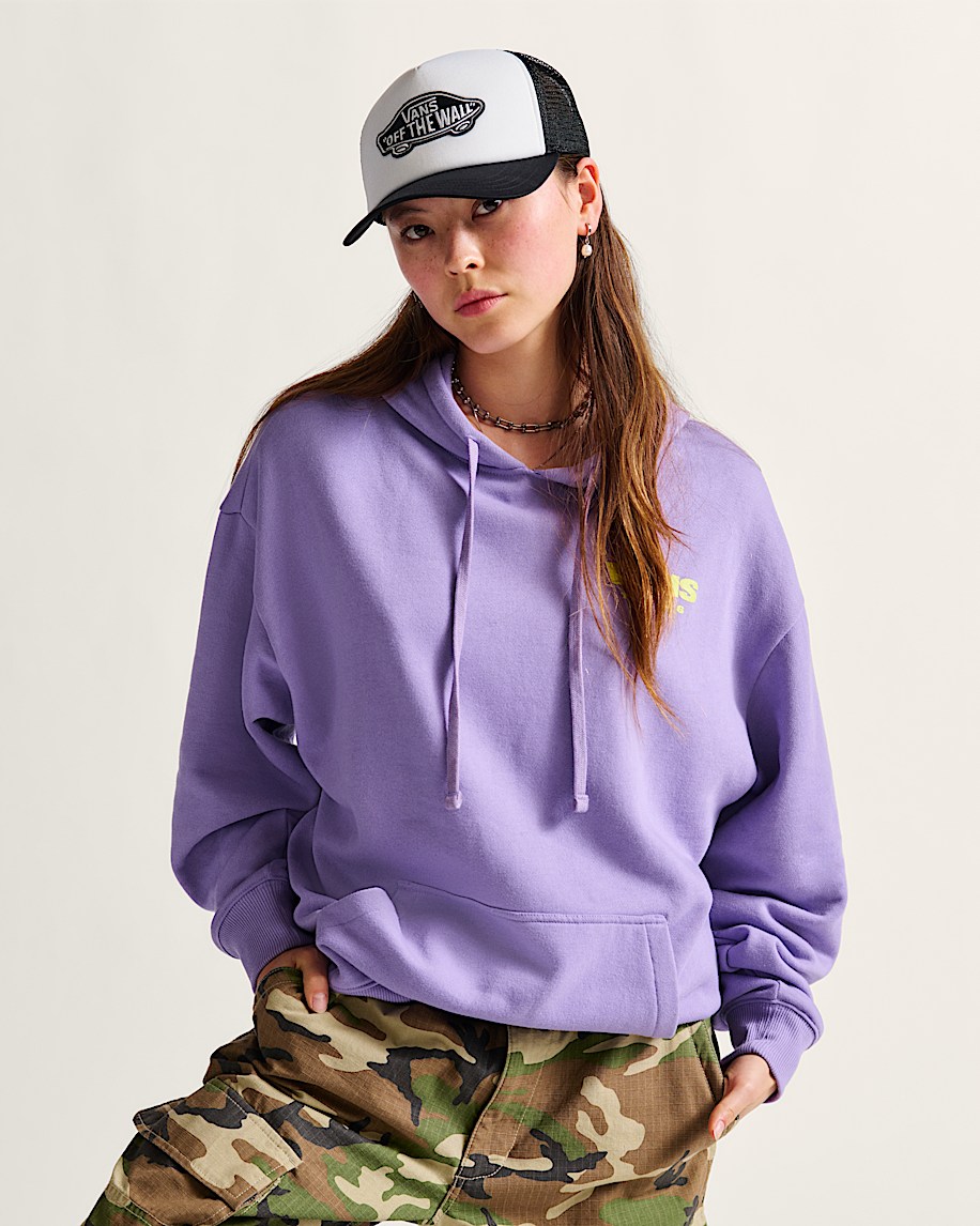 The Suspension Hoodie is a classic kangaroo pocket pullover made of warm and cozy fleece. It also features ribbed details with a screenprinted graphic of a Vans® logo on the front, with a larger version of the logo on the back with additional historical details.