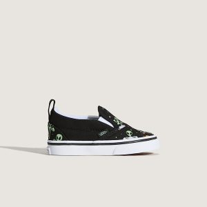 Toddler slip on shoeRecommended for ages 9 months to 4 yearsCanvas upper for a durable and classic lookGlow-in-the-dark alien print for added funPadded collar for enhanced support and comfortSide hook-and-loop closures for easy on and offHeel pull assists with slipping the shoes on quicklyRubber sidewall with classic foxing stripeSignature waffle outsole pattern for reliable grip since '66Vulcanized build for the original look and feelIconic Sidestripe™ insignia