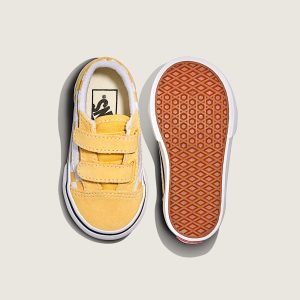 Toddler low-top shoeRecommended for ages 9 months to 4 yearsSturdy suede and canvas uppersPadded collar for enhanced support and comfortDouble hook-and-loop closures for easy on-and-offDurable rubber sidewall with classic foxing stripeReinforced toe bumper for heavy wear and tearSignature waffle outsole pattern for reliable grip since '66Vulcanized sole for superior board feel and flexibilityIconic Sidestripe™ insigniaCheckerboard branding is unmistakably Vans