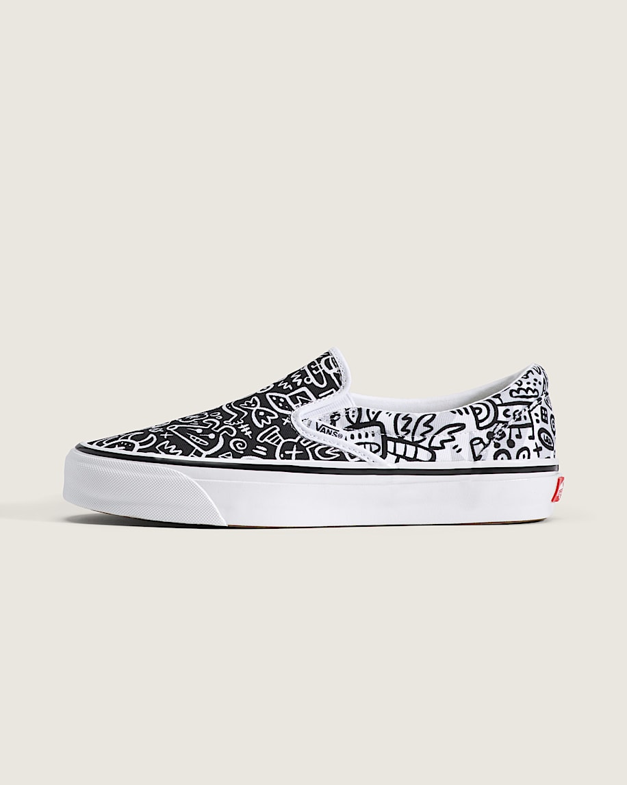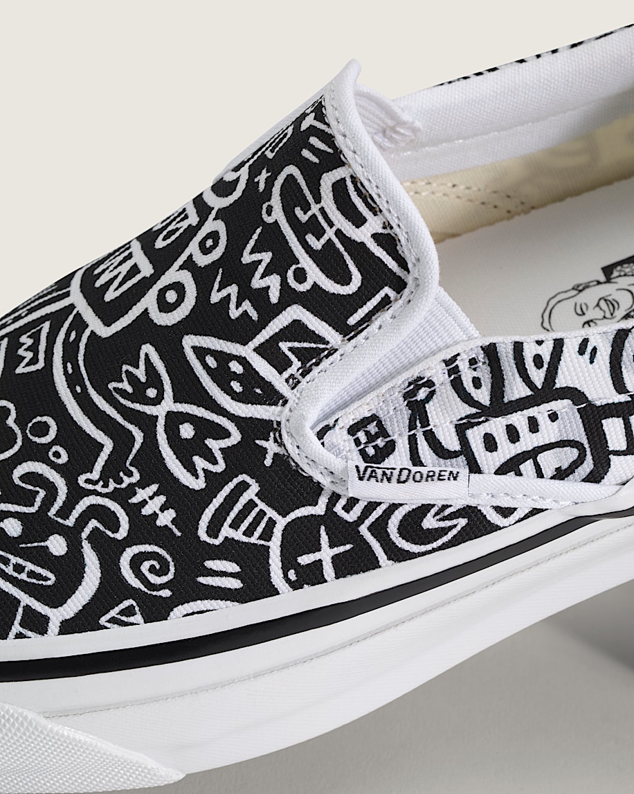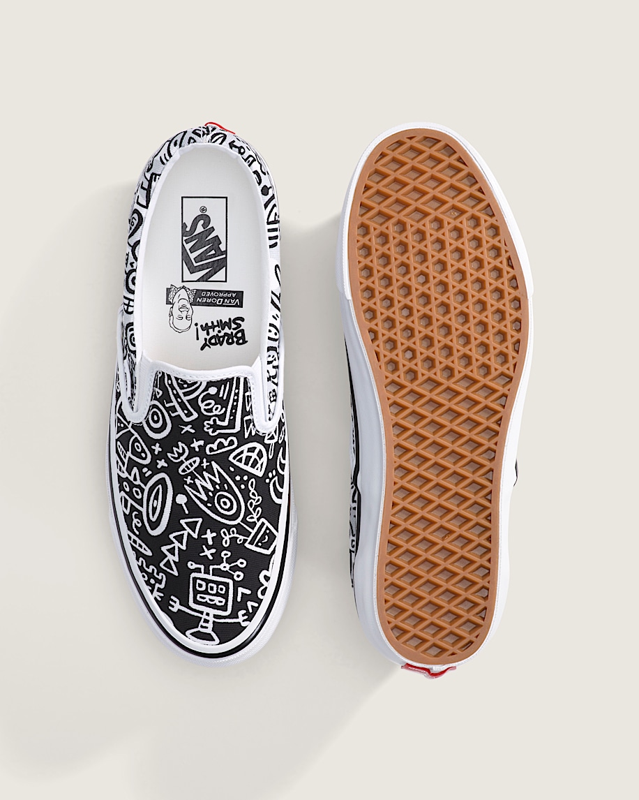 Signature Slip-On shoeCustom artwork by Brady Smith8 oz canvas upper for a light but durable finishHigher sidewall with gloss finishFoxing tape inspired by original 90's Osnaburg reinforced outsolesUpgraded footbed and refined construction provides improved fit and feelSola Foam ADC (All-Day Comfort) insole, soft and durable cushioning, 30% bio-based materialVan Doren Insole X Brady Smith branded insoleSignature waffle outsole pattern for reliable grip since '66Original "Van Doren" heel scab and flag labelCustom packaging