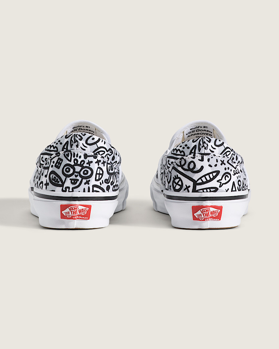 The Premium Classic Slip-On gets a fresh perspective in this Van Doren Approved edition, curated by Steve Van Doren and featuring original artwork by Brady Smith. For years, Brady has been customizing white Slip-Ons and gifting them to friends—so when he and Steve Van Doren met by chance at a book festival, it felt like the right fit. Their shared love of creativity sparked a collaboration that’s been years in the making. This version blends Brady’s signature style with a premium build.