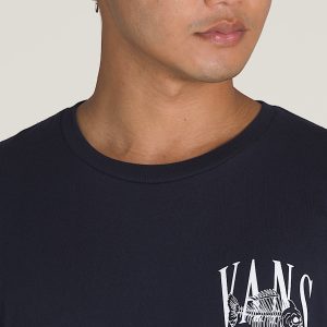 The Vans Resort T-Shirt is a classic fit short sleeve crew neck T-shirt with a screenprinted graphic of a Vans® logo on the left chest, and a fish skeleton interwoven with Vans on the back.