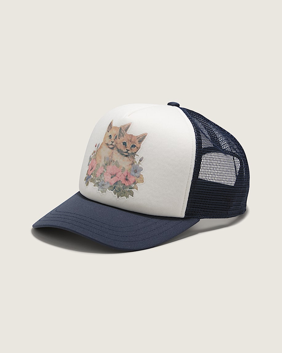Show off the cuddlier side of streetwear in the Vans Supply Trucker Hat, a classic trucker hat with breathable mesh backing, a curved bill, and a direct screenprinted graphic of kittens sitting among flowers.