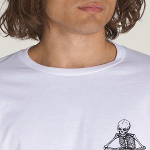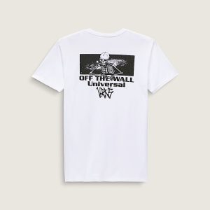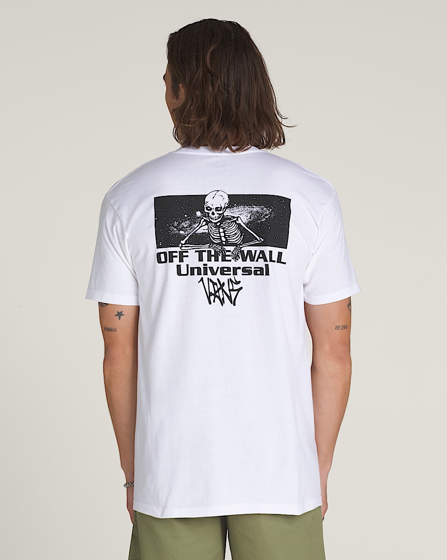 The Vans Universe T-Shirt is a classic fit short sleeve crew neck T-shirt with a screenprinted graphic of a Vans® logo in bones on the front, and a devious skeleton leaning over Vans branding on the back.