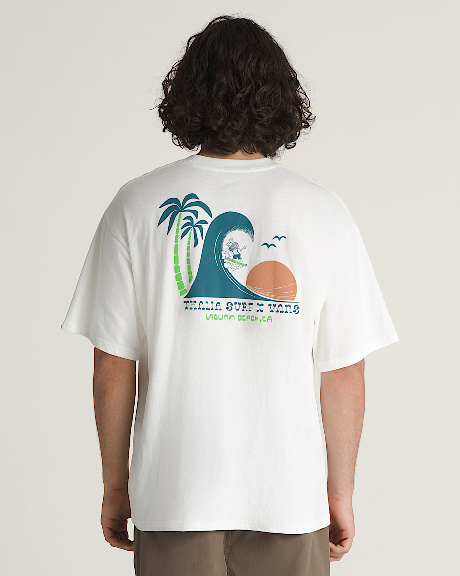 Mens short sleeve teeRibbed neckline for stuctureThalia Surf graphic at chest and backVans woven label on left sleeveLoose fit100% cotton
