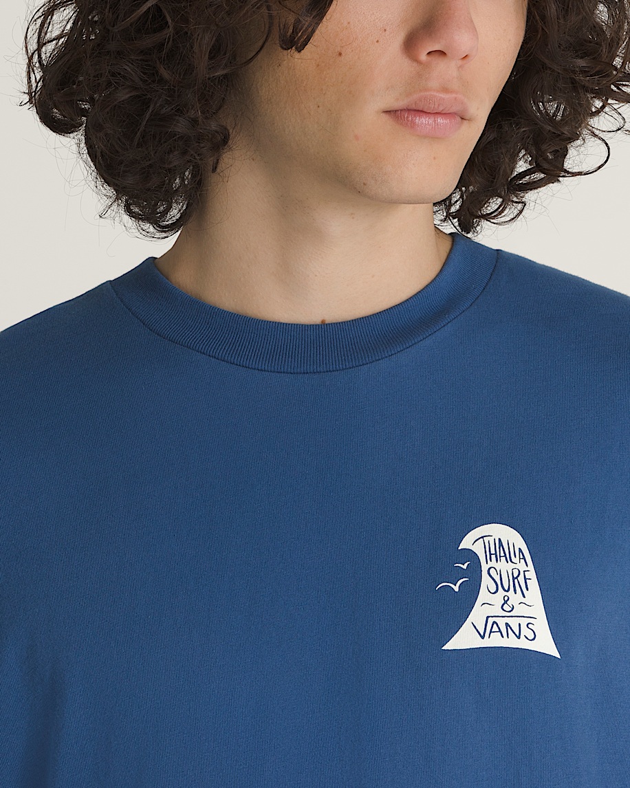 Mens short sleeve teeRibbed neckline for stuctureThalia Surf graphic at chest and backVans woven label on left sleeveLoose fit100% cotton