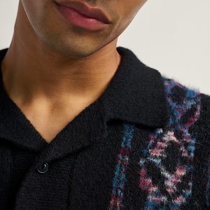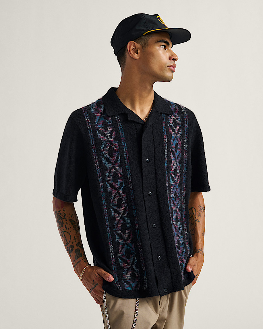 Short sleeve silhouette with camp collarFuzzy knit texture for a soft feelEngineered jacquard artwork for built-in designButton-front closure100% polyester
